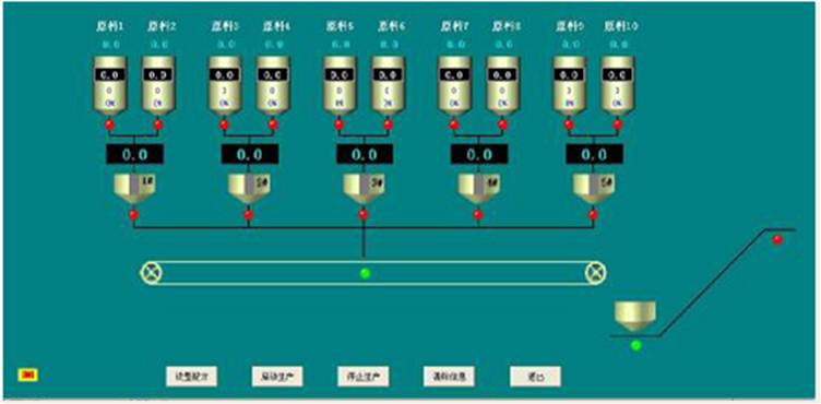 客戶現(xiàn)場有10個儲料倉裝有10種顆粒料,5個稱量倉,1條運輸皮帶和1個提升斗。兩個儲料倉共用一個稱量倉。配料完成由運輸皮帶送至提升斗,由提升斗送至冶煉爐。