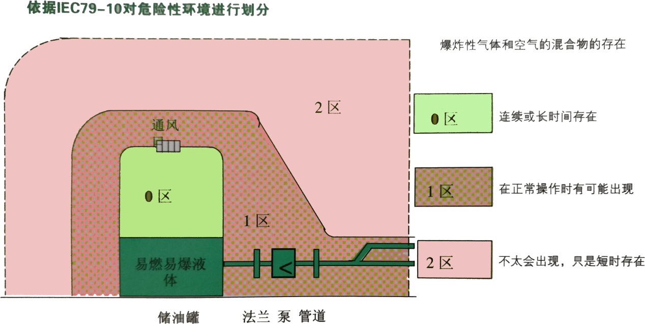 中國(guó)防爆標(biāo)準(zhǔn)與IEC標(biāo)準(zhǔn)一樣,把爆炸性氣體危險(xiǎn)場(chǎng)所劃分為3個(gè)區(qū)域,即0區(qū)Zone 0.1區(qū)Zone 1和2區(qū)Zone 2.
